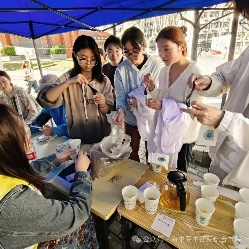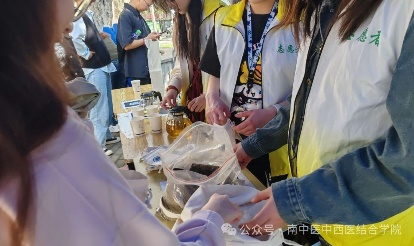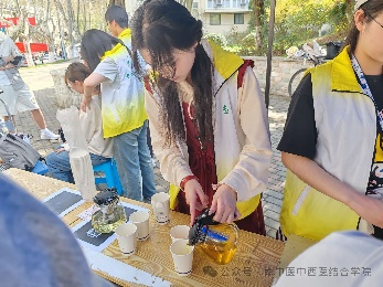 4.药茶分发——志愿者们为南农同学们准备了补血养颜和健脾除湿的药茶,并根据同学们不同的体质,向他们推荐了合适的药茶,在喝茶过程中科普中医养生,传播中医药文化。