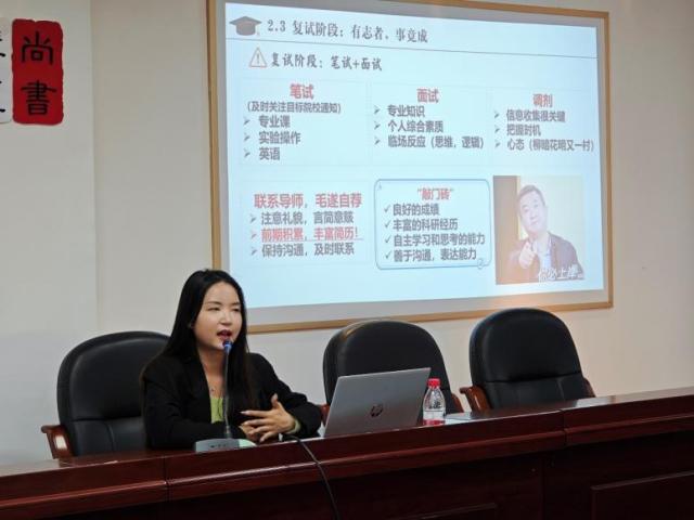 第一位主讲人周媛媛博士为大家带来了主题为“即刻出发,路就在脚下”的考研经验的分享。周媛媛博士从“为什么要考研、如何参加考研、考研需要准备什么”三方面进行阐述,启迪同学们思考考研的初心。