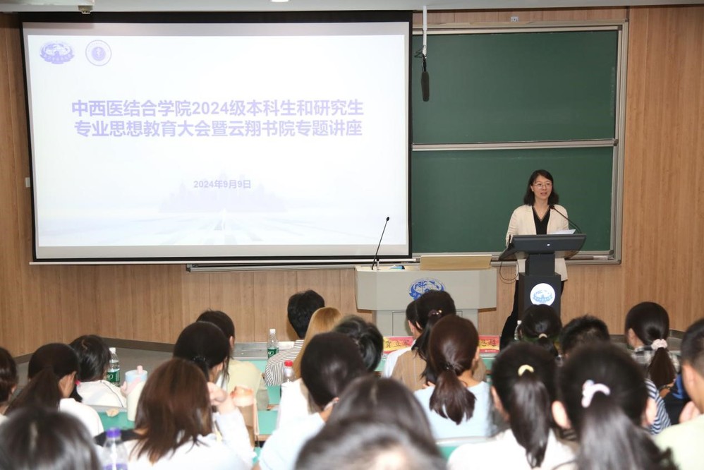 最后,陶伟伟副经理为全体新生做专业思想教育与培养方案解读。他概述了专业背景及发展历程,详细介绍了中西医临床医学(五年制)和中西医临床医学长学制(云翔班)的培养目标和培养要求,授予学位的要求,主干课程的安排,以及专业学习环节的注意要点,为新生的专业发展规划指引了方向。