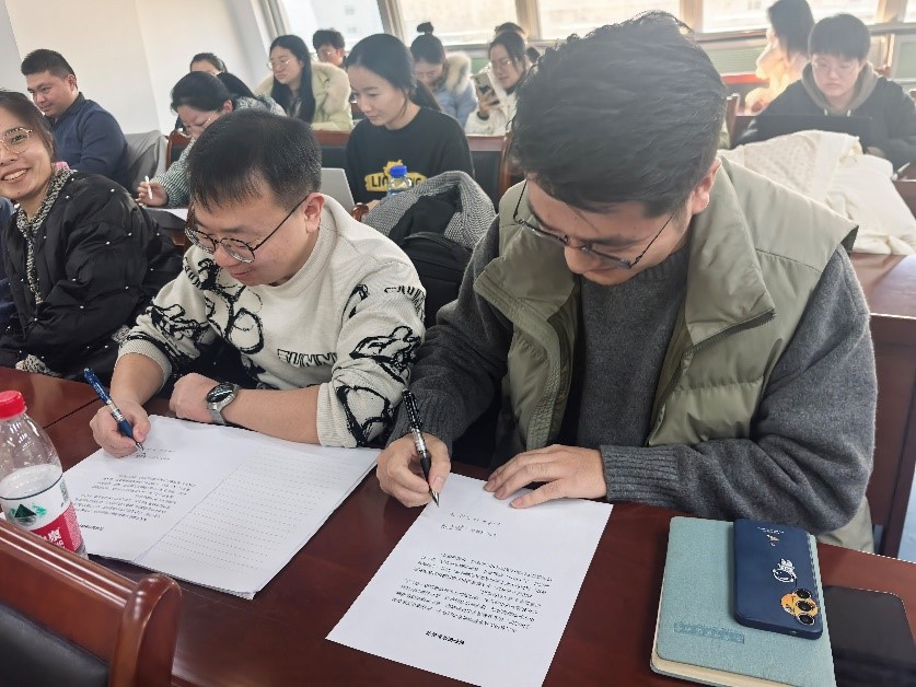 最后,参会的全体师生进行科研诚信承诺书的签署,对严格遵守国家有关法律法规、社会公德及学术道德规范,践行科研诚信要求、坚决杜绝科研不端行为作出承诺。