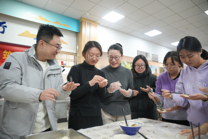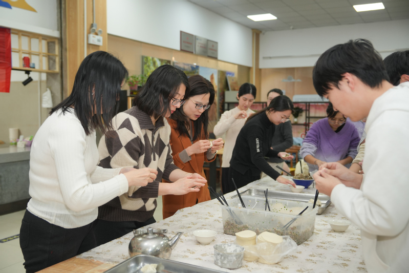 随后大家开始齐心协力包饺子,师生围在长桌旁,交流各地饺子制作技巧,传统褶花与创意包法齐现,各种花样层出不穷。各民族员工借此机会分享家乡节庆习俗与饮食文化,让现场师生感受多民族文化的魅力与交融。
